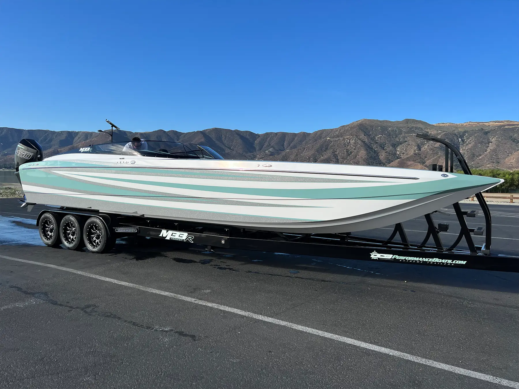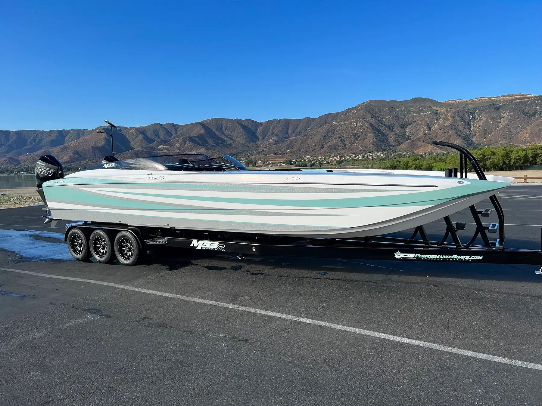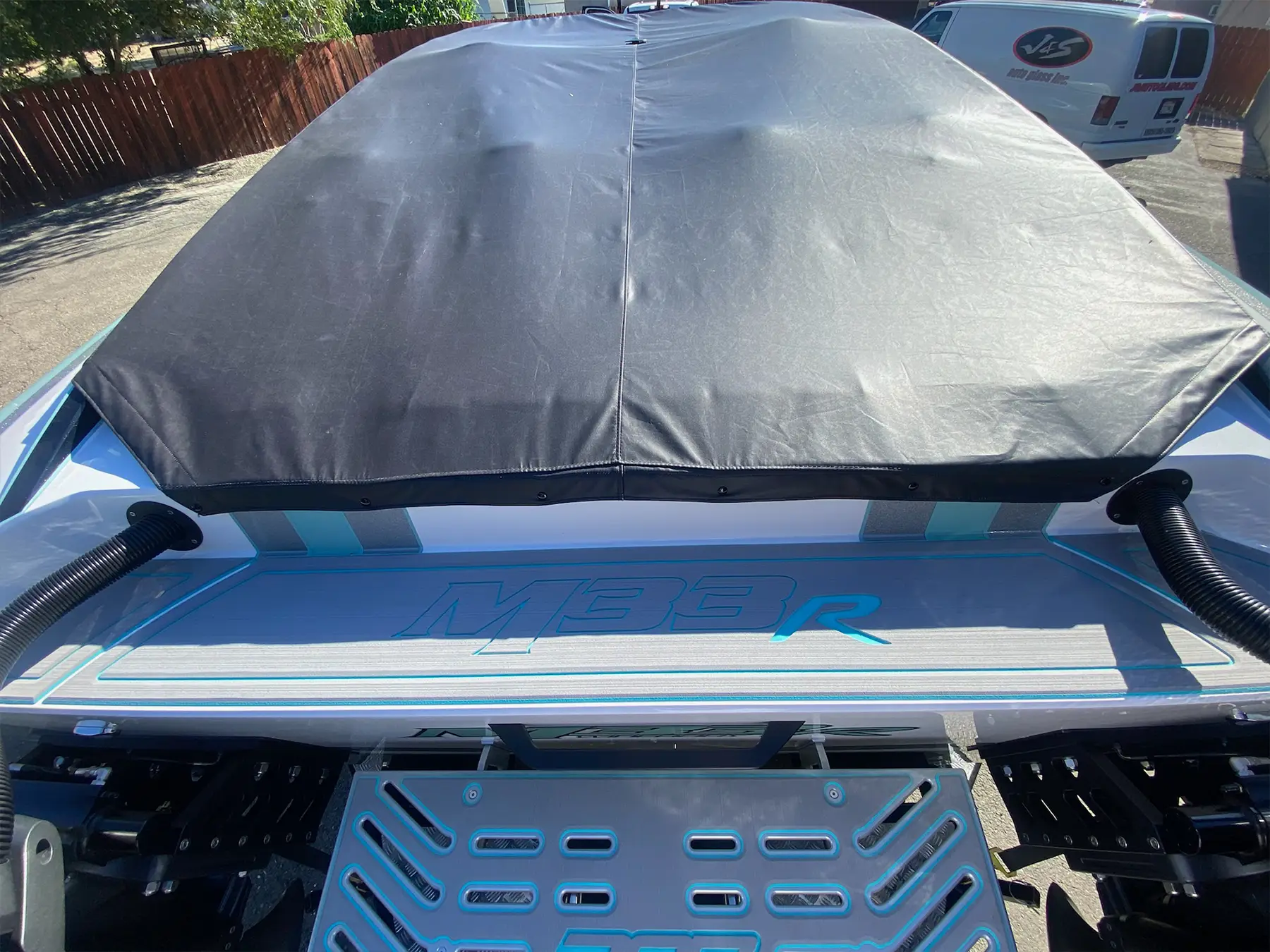 - High gloss white gel coat with black windshield register • Custom bow and stern half cap